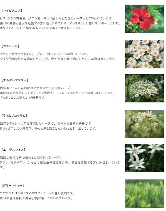 抗酸化力や薬効に優れ、ビタミン豊富なフラワーハーブエキスをブレンドし、ゆたかなフラワーアロマに包まれ心身ともにリラックス効果のある、すっきりと飲めるパウダータイプのドリンクです。